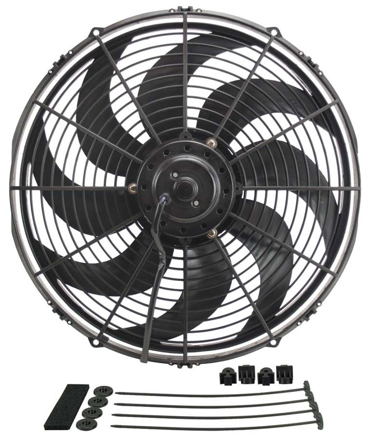 Electric Cooling Fan – Dyno Cool – 16 in Fan – Push / Pull – 1980 CFM – 12V – Curve Blade – 16-1/2 x 15-5/8 in – 3-5/8 in – Install Kit – Plastic – Kit