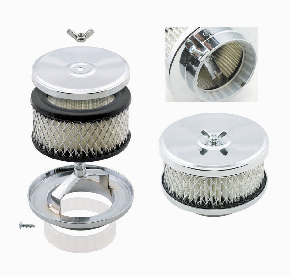 Air Cleaner Assembly – Deep Dish – 4 in Round – 2-3/4 in Tall – 2-5/16 in or 2-5/8 in Carb Flange – Raised Base – Steel – Chrome – Kit