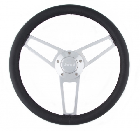Steering Wheel – Billet Series for Jeep – 14-3/4 in Diameter – 1/2 in Dish – 3-Spoke – Black Leather Grip – Jeep Logo – Billet Aluminum – Polished – Each