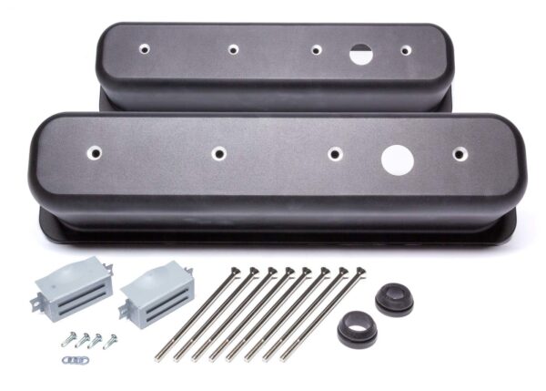 Valve Cover – Tall – 3-11/16 in Height – Breather Holes – Hardware Included – Aluminum – Black Paint – Center Bolt – Small Block Chevy – Pair