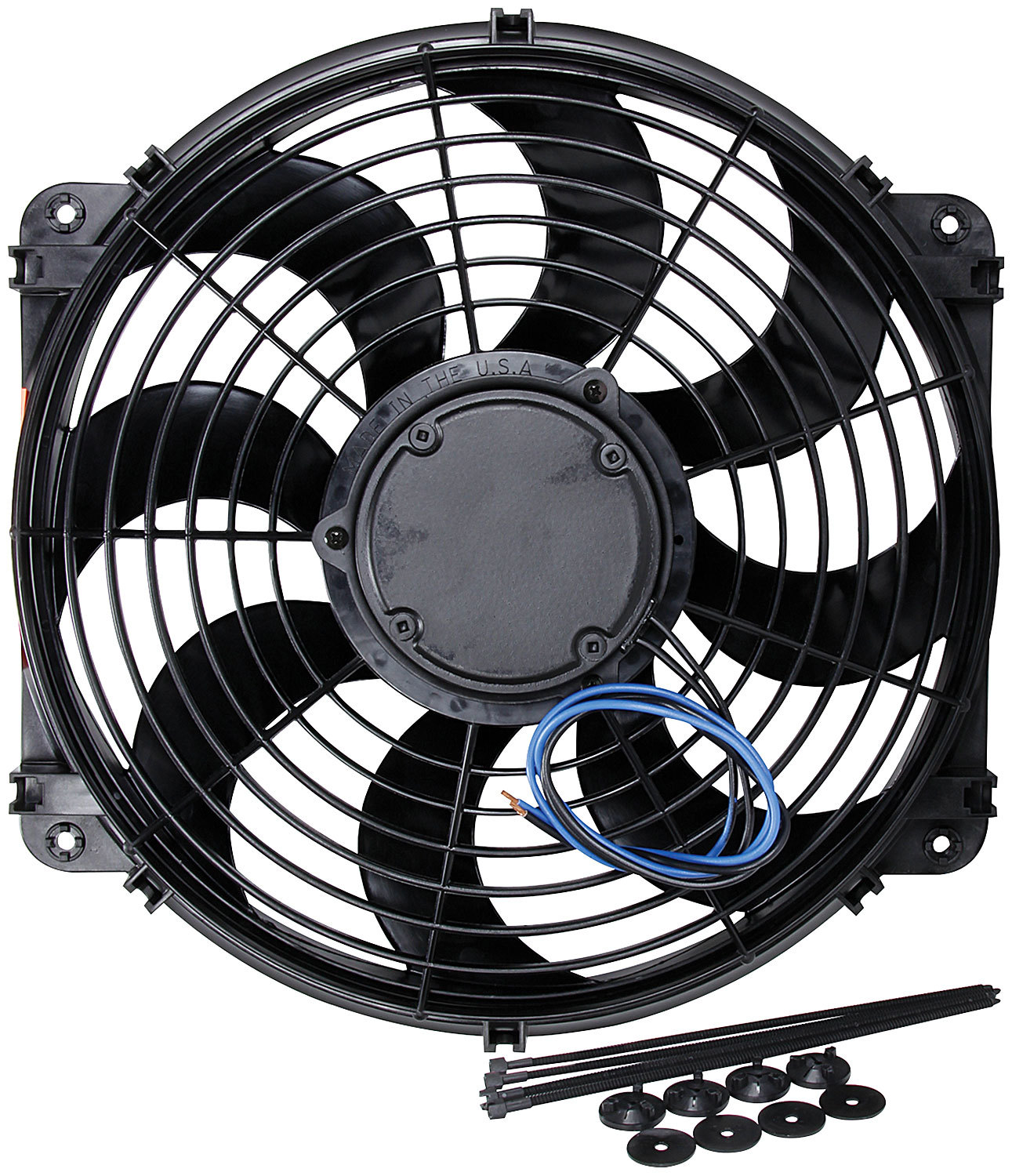 Electric Cooling Fan – 14 in Fan – Push / Pull – 1530 CFM – 12V – Curved Blade – 13-3/4 x 14-5/8 in – 3-3/4 in Thick – Plastic – Kit