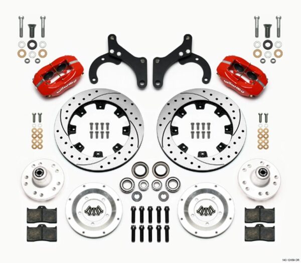 Brake System – Forged Dynalite Big Brake – Front – 4 Piston Caliper – 12.190 in Drilled / Slotted Iron Rotor – Aluminum – Red Powder Coat – GM Passenger Car 1959-64 – Kit