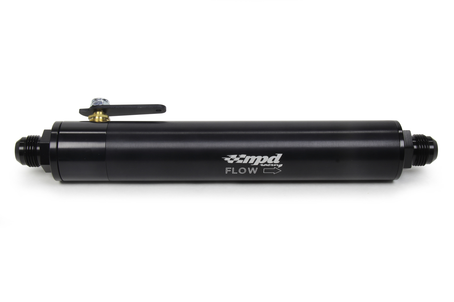Fuel Filter – In-Line – 100 Micron – Stainless Element – 12 AN Male Inlet – 12 AN Male Outlet – Shut Off Valve – Aluminum – Black Anodized – Each
