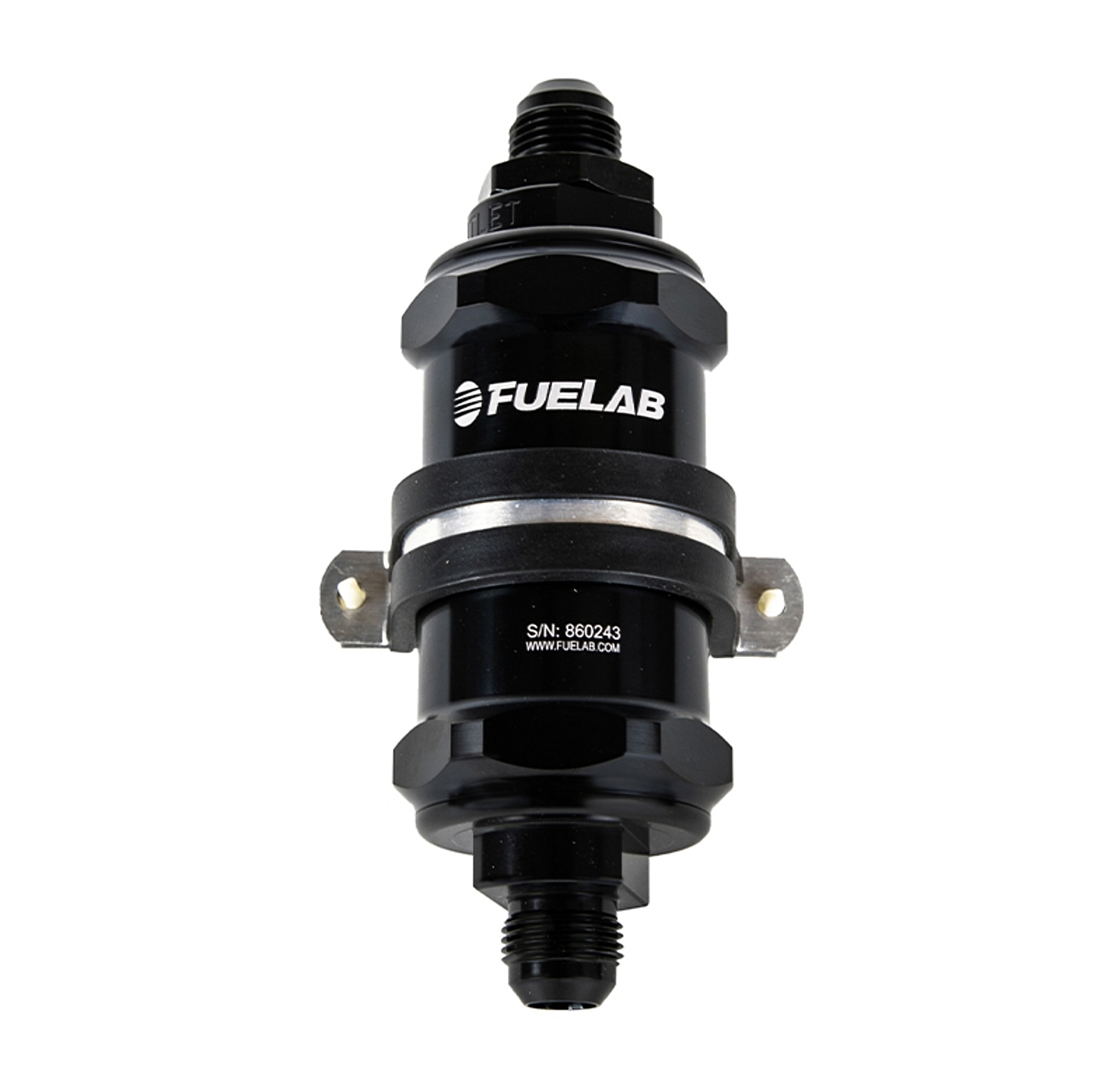 Fuel Filter – In-Line – 6 Micron – 3 in Microglass Element – 8 AN Male Inlet – 8 AN Male Outlet – Integrated Check Valve – Aluminum – Black Anodized – Each