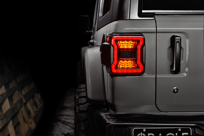 Aggressive Blacked-Out design featuring upgraded LEDs for all tail lamp functions including Driving Lights, Brake Lights, Reverse Lights, and Turn Signals. Add the Premium-Style hour-glass LED design to your JL Wrangler with these new LED Tail Lamps from ORACLE Lighting. Easy Plug-and-Play installation, plugs directly into the factory JL tail light socket. Load Equalizers are pre-wired so no warning lights on the dash will occur, just install and drive! Durable IP67 waterproof rating, designed to fit all JL Wranglers without the factory LED package.