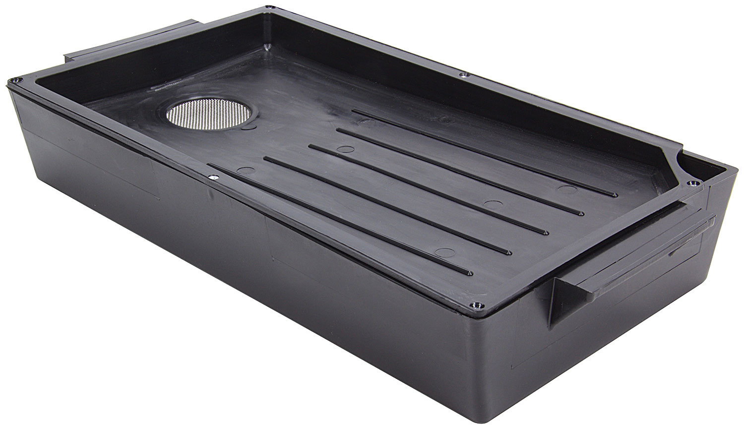 Drain Pan – Quick Change – 14 x 8 in Rectangle – 2-1/2 in Deep – Stainless Catch Screen – Integrated Transfer Spout – Plastic – Black – Each